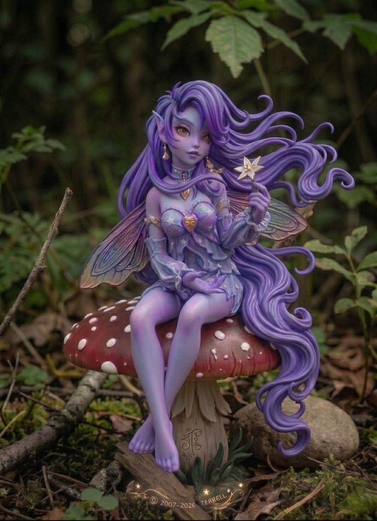 This is one of my ideas with my "Iridescent Fairy" (Such sad Eyes) as a figurine. I hope that I get to see her as a collectible one day. Cartoon art and concept are mine; everything else was AI assisted.