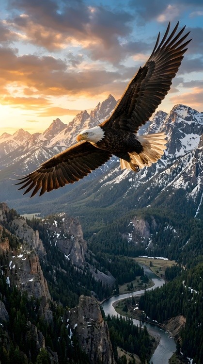 Majestic bald eagle soars with outstretched wings above a breathtaking mountain valley where golden light bathes snow-capped peaks and a winding river, showcasing stunning wilderness beauty and the bird's powerful freedom at sunrise.
