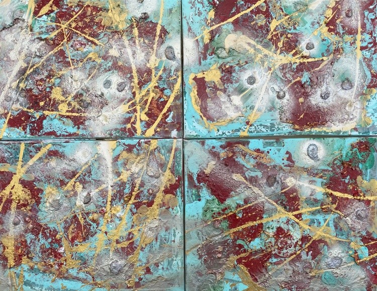 An abstract piece featuring swirling patterns of red, blue, and gold. The paint splatters and layered colors create a dynamic, energetic feel.