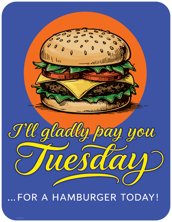 J. Wellington Wimpy was created by cartoonist E.C. Segar for his newspaper strip Thimble Theatre, later popularly known as the Popeye comic strip. Wimpy first appeared on May 3, 1931, initially as an unnamed, somewhat clerical “deacon” character before evolving into the familiar hamburger-loving moocher later in 1931–1932. By late 1932, he was a regular presence in the Sunday Popeye pages, and by March 1933, he had become one of the main supporting characters in the daily strip, alongside Popeye and Olive Oyl. Wimpy is characterized by his soft-spoken manner, laziness, cowardice, and constant schemes to get hamburgers on credit, epitomized by his famous line, “I’d gladly pay you Tuesday for a hamburger today.” His look and manner were loosely inspired by William “Windy Bill” Schuchert of Chester, Illinois.
