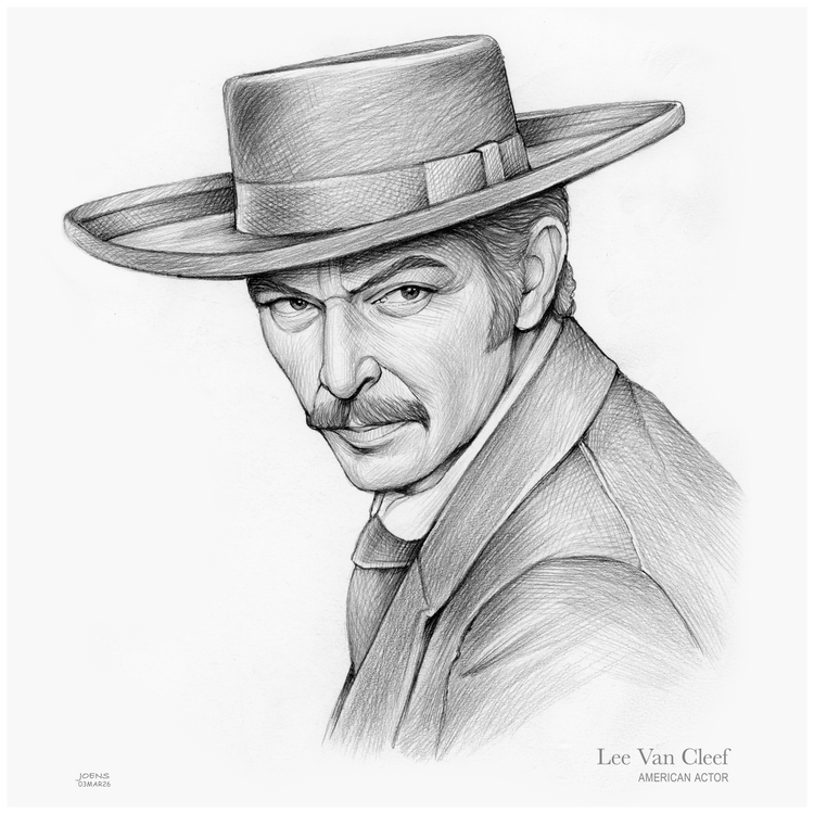 Lee Van Cleef, Jr. (1925–1989) was an American actor whose razor-sharp features and steely gaze made him one of cinema’s most unforgettable villains. After early supporting roles in Hollywood Westerns, he achieved international fame in Sergio Leone’s Spaghetti Westerns, especially as the menacing "Angel Eyes" in The Good, the Bad and the Ugly. Van Cleef’s commanding presence, minimal dialogue, and moral ambiguity created a powerful screen persona that continues to influence the genre. Though often cast as the antagonist, he became a beloved cult icon worldwide. Pencil drawing by artist Greg Joens.