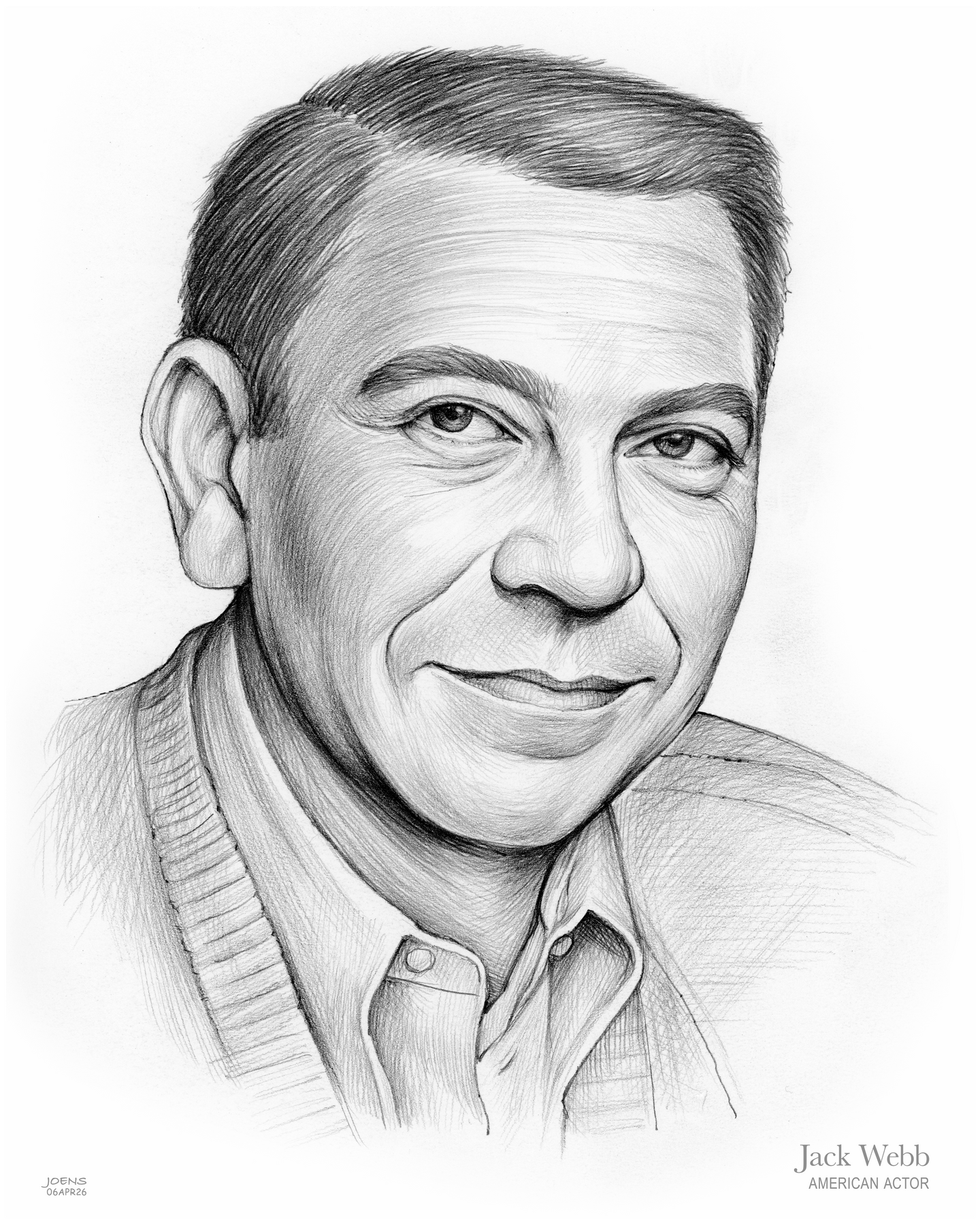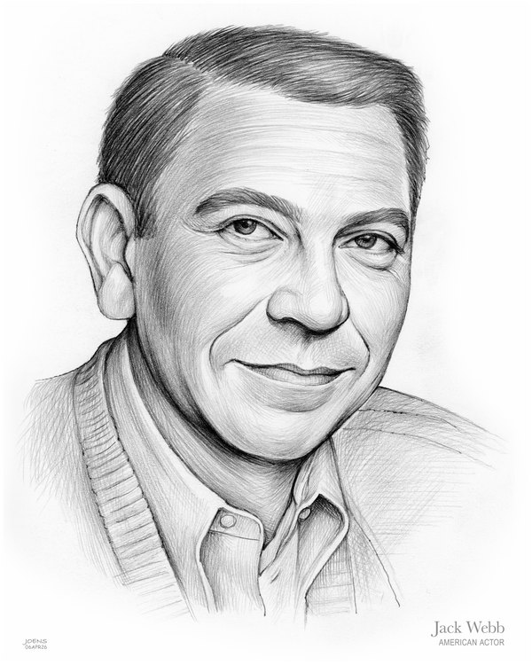 Jack Webb (1920–1982) was an American actor, director, and producer best known for creating and portraying Sergeant Joe Friday on the groundbreaking television series Dragnet. With his clipped delivery and unwavering demeanor, Webb’s Joe Friday became an icon of straightforward, no-nonsense law enforcement. Dragnet revolutionized police dramas, emphasizing realism, procedure, and moral clarity, influencing countless shows that followed. Beyond acting, Webb championed authenticity in storytelling, bringing everyday heroism and civic duty into American living rooms. His legacy endures as a symbol of integrity and quiet courage, reminding audiences that honor is often found in simply doing one’s job well. This tribute is accompanied by a pencil portrait of Jack Webb by artist Greg Joens, whose finely detailed drawing captures the resolute gaze and steady presence that defined Webb’s unforgettable Joe Friday.