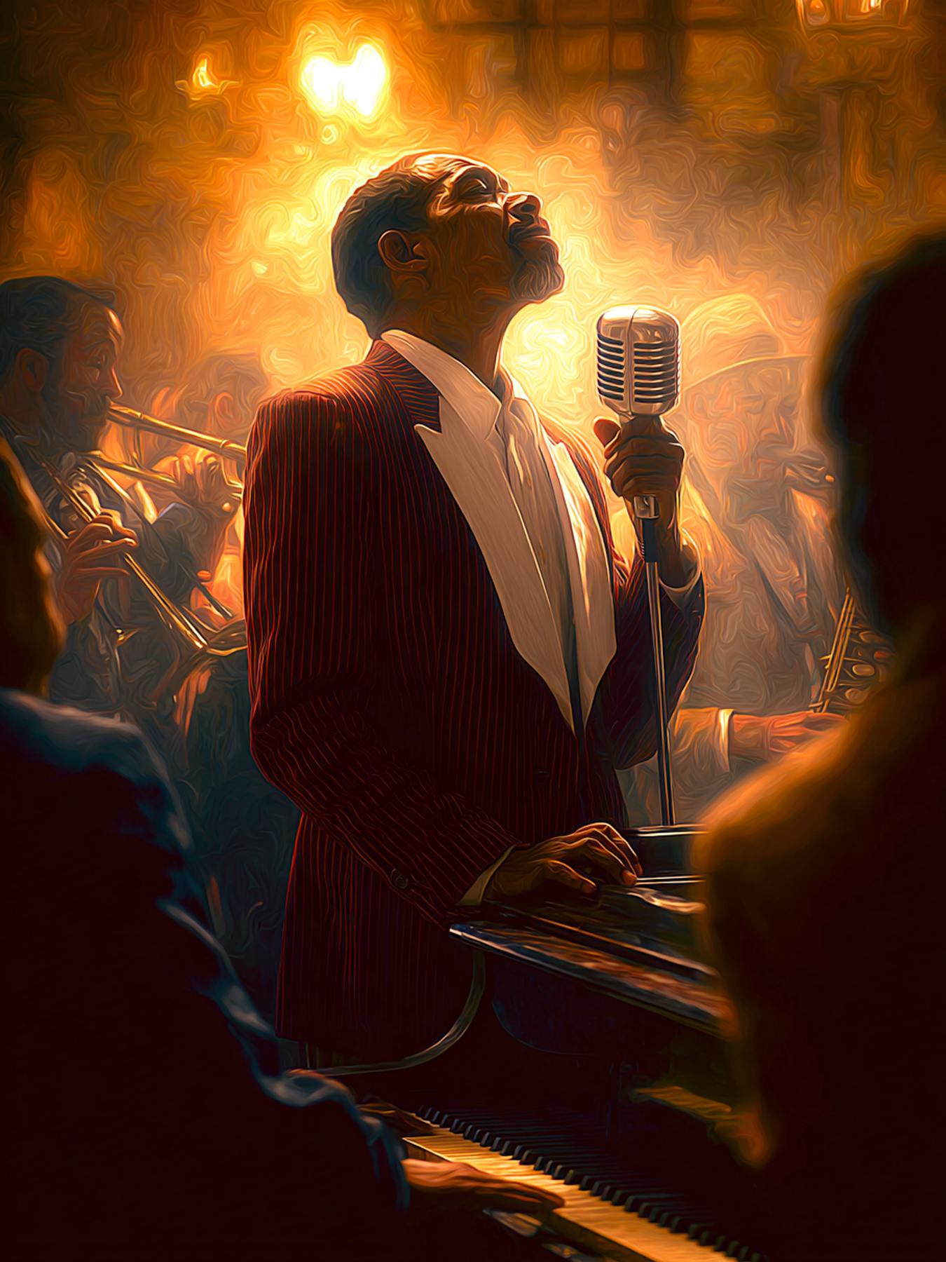 Bathed in a golden haze of smoke and spotlight, the jazz singer stands suspended in a moment of pure emotion, his voice carrying the weight of lived experience. His upward gaze and tightened grip on the microphone suggest a quiet struggle within—a contemplative release where sorrow, memory, and passion pour into every note.