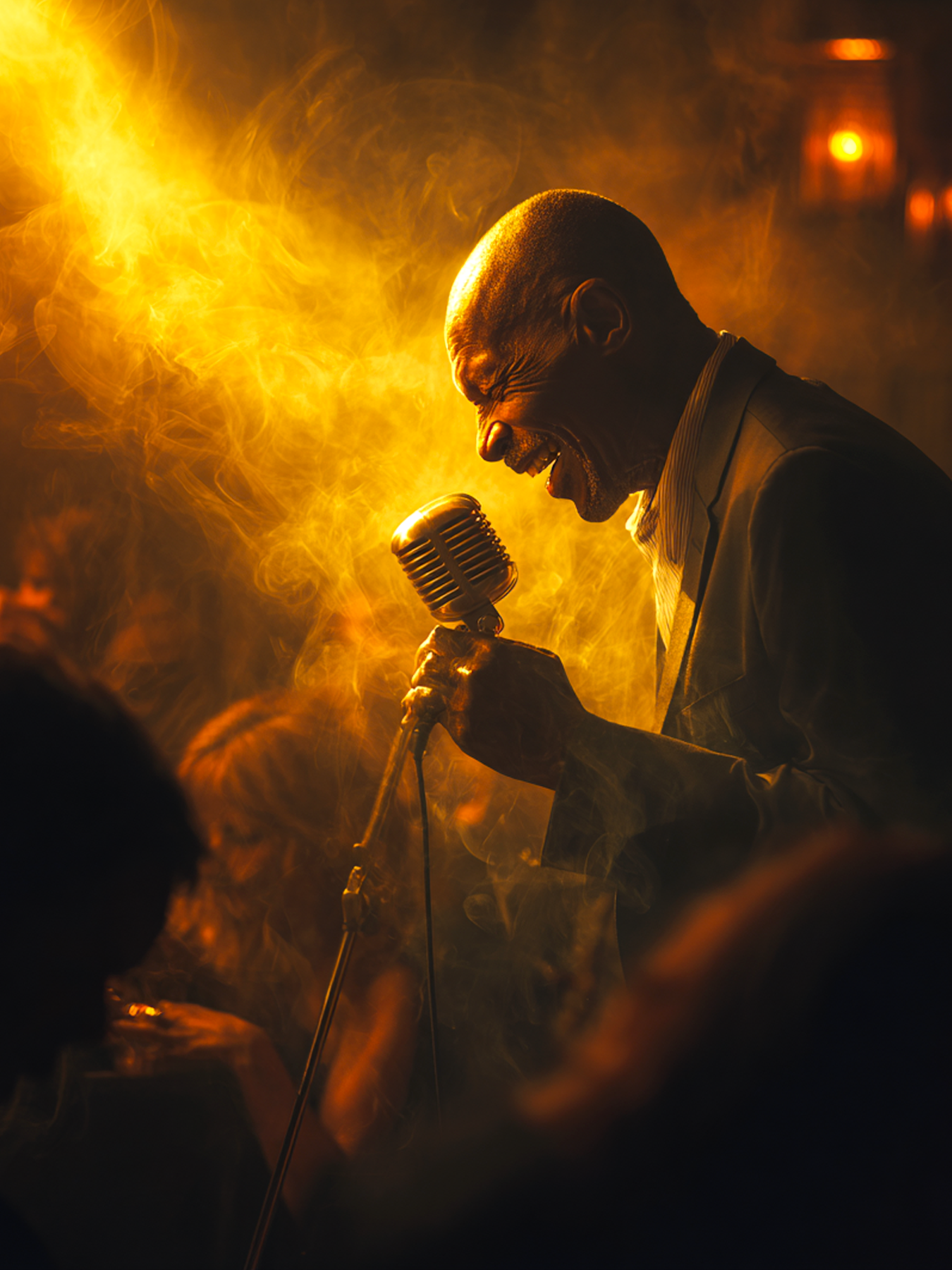 Wrapped in a haze of golden light and drifting smoke, the jazz singer bends into the moment, his voice seeming to pull memories from somewhere deep within. His expression carries both ache and release, as if each note is a quiet confession—an introspective unraveling shaped by time, loss, and soul.