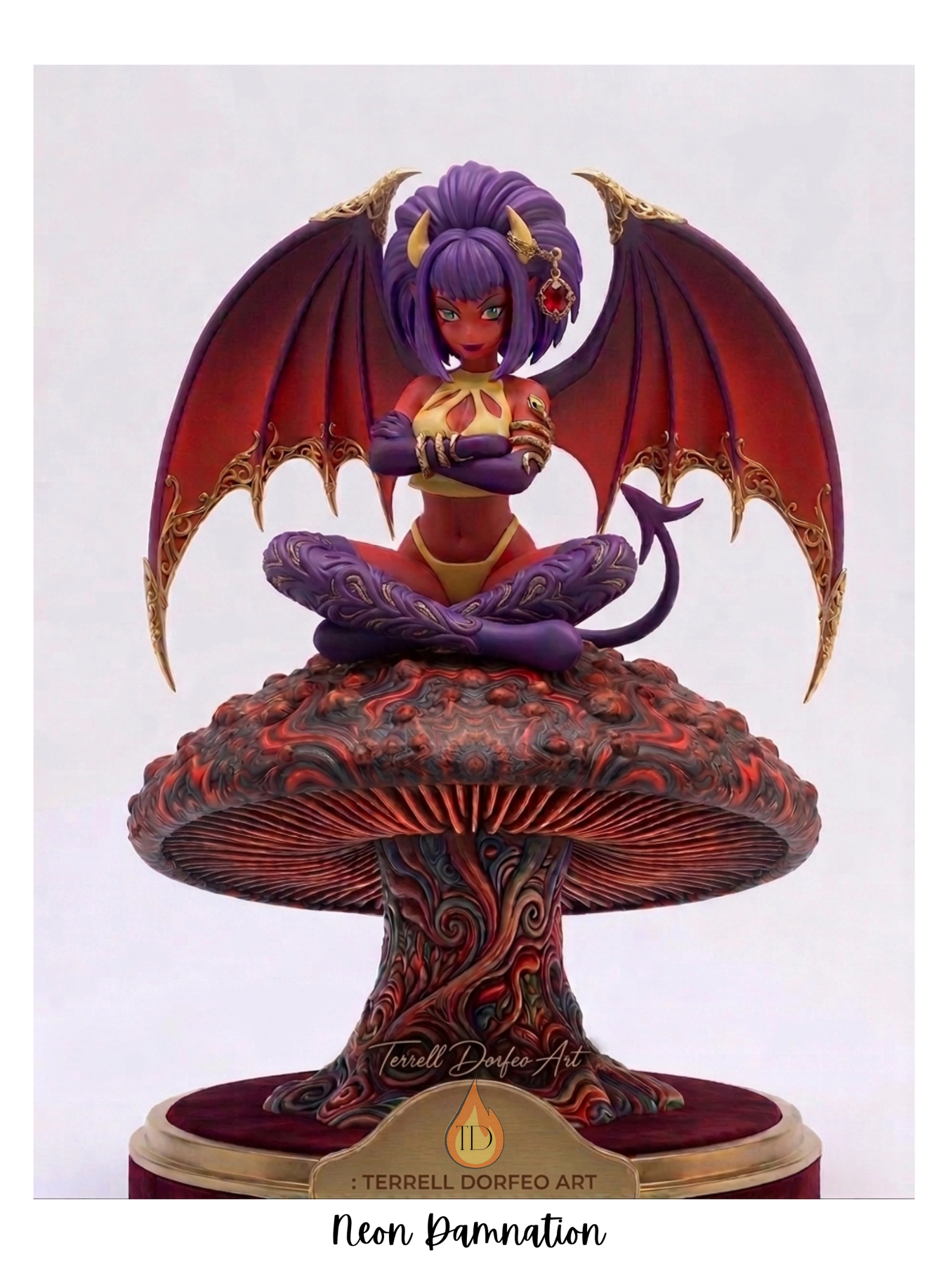A Succubus maiden contemplates her next victim while sitting on a warty toadstool. This is a mockup figurine of my art. I think some green jewels on her wing jewelry would make her colors pop! Not 100% with the toadstool base, so I may re-design it later.