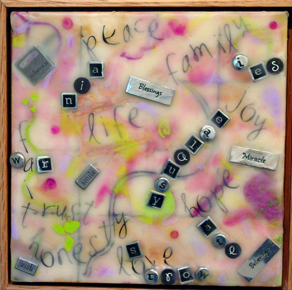 "Life" is a 8 X 8 encaustic collage on birch panel. I created this piece because I wanted to show many aspects of life whether pleasant or unpleasant but didnt want the piece to be in your face harsh. Just as in life, we all have hidden thoughts, feelings or experiences we don't openly share with others, but keep camouflaged or hidden.