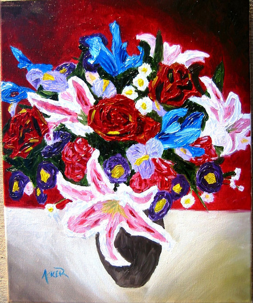This is a 16"x20" Oil on stretched canvas of a bouquet of flowers. The texture of the paint is medium-thick to thick. Painted by Aaron Acker