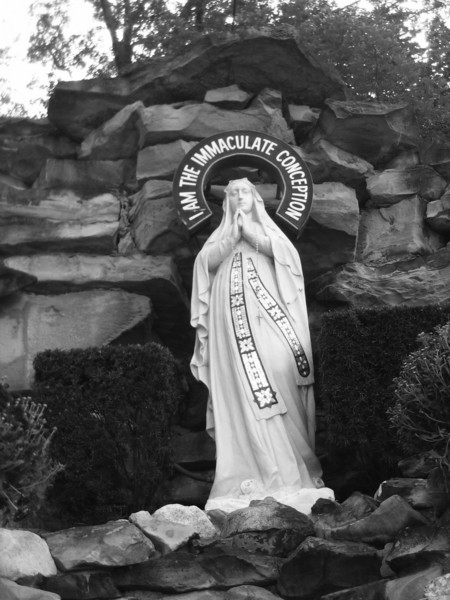 This is a picture of just the Statue of Mary. This statue stand atop a cove with caves for prayer and candle lighting and prayer, there is also a mass held right outdoors. People come all through the year to drink the holy water that comes out at the base of the statue. People drink it in hope to be blessed by the Holy Family. This picture was taken at: The Shrine & Grotto of Our Lady of Loudes, Providence Heights: Sisters of the Most Holy Order. Euclid, Ohio. www.srstrinity.com
