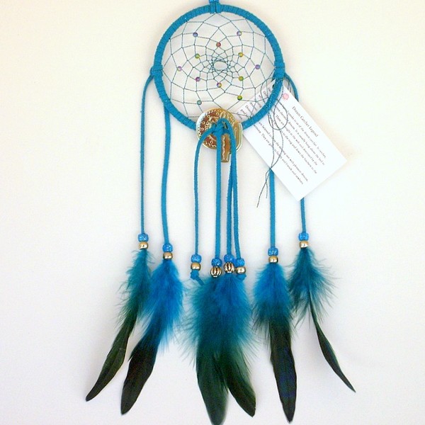 turquoise suede lace, 4" ring, tropical teal metallic web with iridescent multi-color foil beads, turquoise sparkle and silver metal beads, silver saguaro in the sun concho, turquoise bronzed rooster schlappen feathers, 20" long, with legend card to personalize