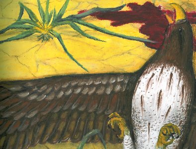 The majority of a drawing I did in response to another drawing of mine, which was a soaring eagle as seen from below, wings outspread and blue skies behind it. There is a bit more of the actual drawing, yet I was not able to scan the whole thing.