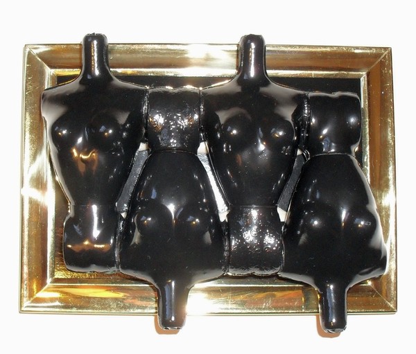 mixed media assemblage using recycled picture frame, Barbie doll parts and spray paint