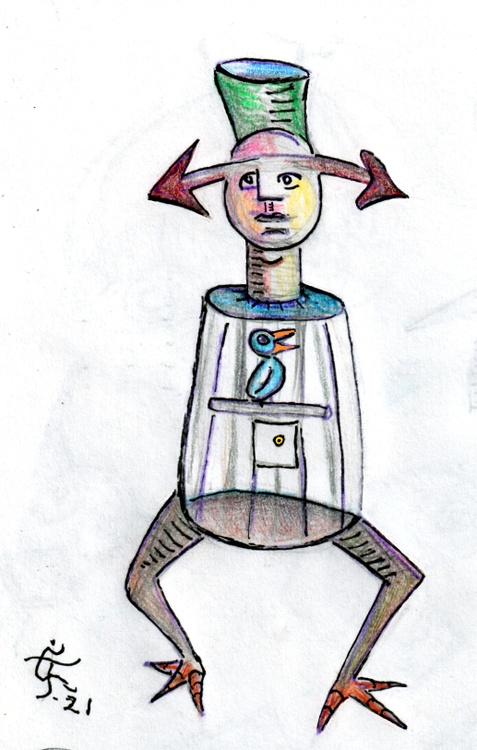 There was a movie with George C. Scott, a great actor, with the name They Might Be Giants. At least as I recall and this movie became the name of a two-man musical group who was (is?) very quirky and very talented. Anyway, the musical group has a song with the same name of this small color drawing. Things go 'round and 'round, you know. This is a roughly 6 by 4.5 inches gel pen drawing with color pencil. It's a rough draft of something that I hope Original Jones Art will flesh out even more here in northwest Austin, Texas.