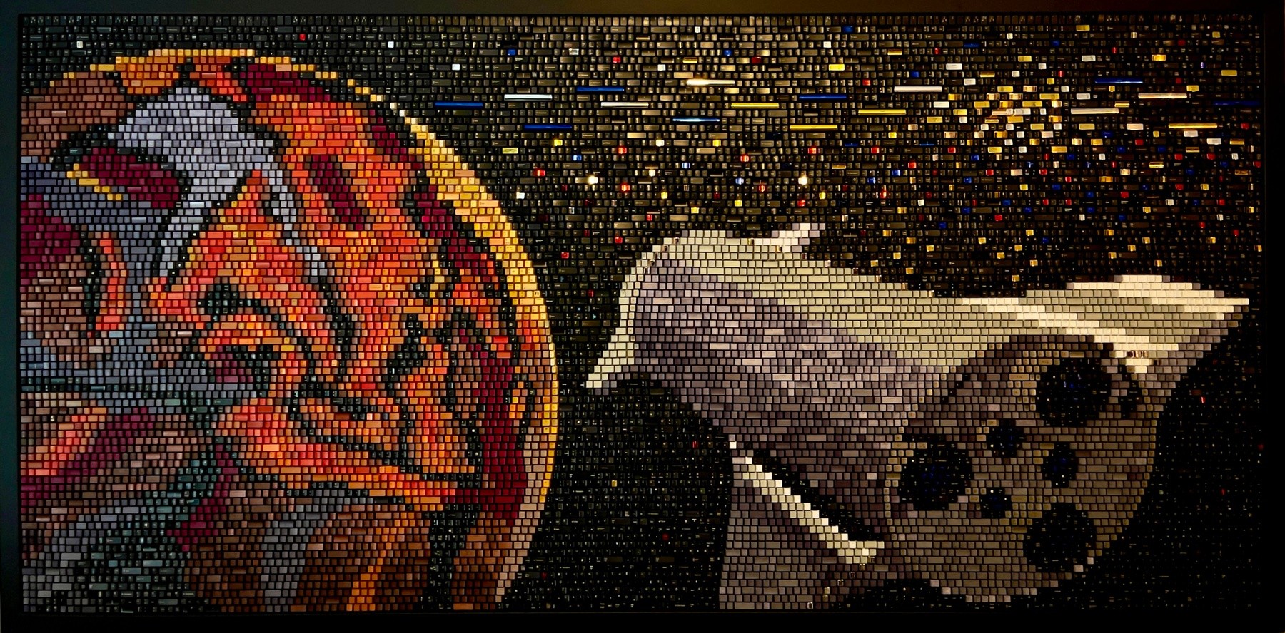 “JOURNEY TO MARS” 60 x 120 Now a permanent feature in the main lobby of a brand new Hilton Garden Inn opening in just a few weeks located in Cape Canaveral, right across from Space Force launch sites. We literally watched a Falcon 9 Rocket launch carrying satellites into space for Amazon as we approached early this morning. This launch just so happened to mark the 100th SpaceX mission of 2025. After months of connecting logistical dots from Asheville, North Carolina to Tampa, Florida, this 50 square foot recycled computer key mosaic took 300 hours and 11,139 keys to complete. SPACE COAST COMPUTER KEY MOSAIC Title: Journey To Mars Created by Artist Doug Powell Website: DougPowellArt.com Oviedo, Florida June, 2025 ?Made with 11,139 keys from up cycled computer keyboards ?Took 300 hours to complete ?Uses both original and dyed key caps for color. ?Mounted in a 2” x 2” welded aluminum frame, powder-coated wrinkle black ?Mosaic dimensions: 60” H x 120” W ?Weight: 95 lbs While serving in the US Navy, Doug witnessed the second launch of Space Shuttle Columbia (STS-2) from Orlando Naval Training Center on November 12, 1981, while studying surface ship navigation. “I want the viewer to ponder the infinite, profound combination of thoughts, ideas, and inspirations that have passed through this ‘intellectual porthole’—all made possible with the common computer key.” —Doug Powell Florida’s Role in Space Exploration Florida has been a launchpad for American space efforts for decades. NASA’s Kennedy Space Center (KSC), established in the early 1960s, was home to the Apollo missions and the Space Shuttle era, making the Space Coast a focal point of innovation. In 2014, SpaceX leased the historic Launch Pad 39A at Kennedy Space Center, ushering in a new era of private-public space collaboration. Their presence has revitalized the region—boosting the economy, creating jobs, and inspiring science, technology, engineering and mathematics programs across local communities. Florida continues to be at the forefront of space exploration, with a legacy shaped by NASA and propelled into the future by SpaceX. There is an extensive word search spelled out with the keys hidden throughout the artwork. “Occupy Mars.” Elon Musk “The goal is to make humanity a multi planetary species.” Elon Musk “I would like to die on Mars. Just not on impact.” Elon Musk “Mars is the steppingstone to the stars.” Author unknown “The Red Planet is calling.” Author unknown “One Starship a day keeps extinction away.” Elon Musk “We’re going to Mars because it’s there and we can.” Elon Musk “The universe is a pretty big place. If it’s just us, seems like an awful waste of space.” Carl Sagan “Exploration is really the essence of the human spirit.” Frank Borman (Commander Apollo 8) “The cosmos is within us. We are made of star-stuff. We are a way for the universe to know itself.” Carl Sagan “The stars are the destination, and the journey is the reward.” John Glenn “Every generation must climb its own mountain: ours is the ascent into space.” Buzz Aldrin “We stand at the edge of infinity, and it is our privilege to step forward.” Kathryn Sullivan “Beyond the horizon of our world lies the horizon of all worlds and we are called to cross it.” Wernher von Braun “The stars don’t look bigger, but they do look brighter.” Sally Ride – First American woman in space. “That’s one small step for man, one giant leap for mankind.” Neil Armstrong
