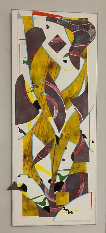 the is a 12" x 36" canvas. Three other paintings were recycled to make this one! This is a recent painting that I added blue highlights to.