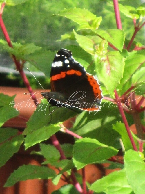 A red admiral butterfly (also known as Vanessa Atlanta) on Fuschia foliage. Photograph.