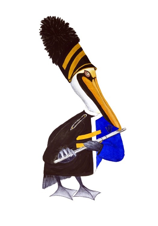 Watercolor of a flute playing pelican