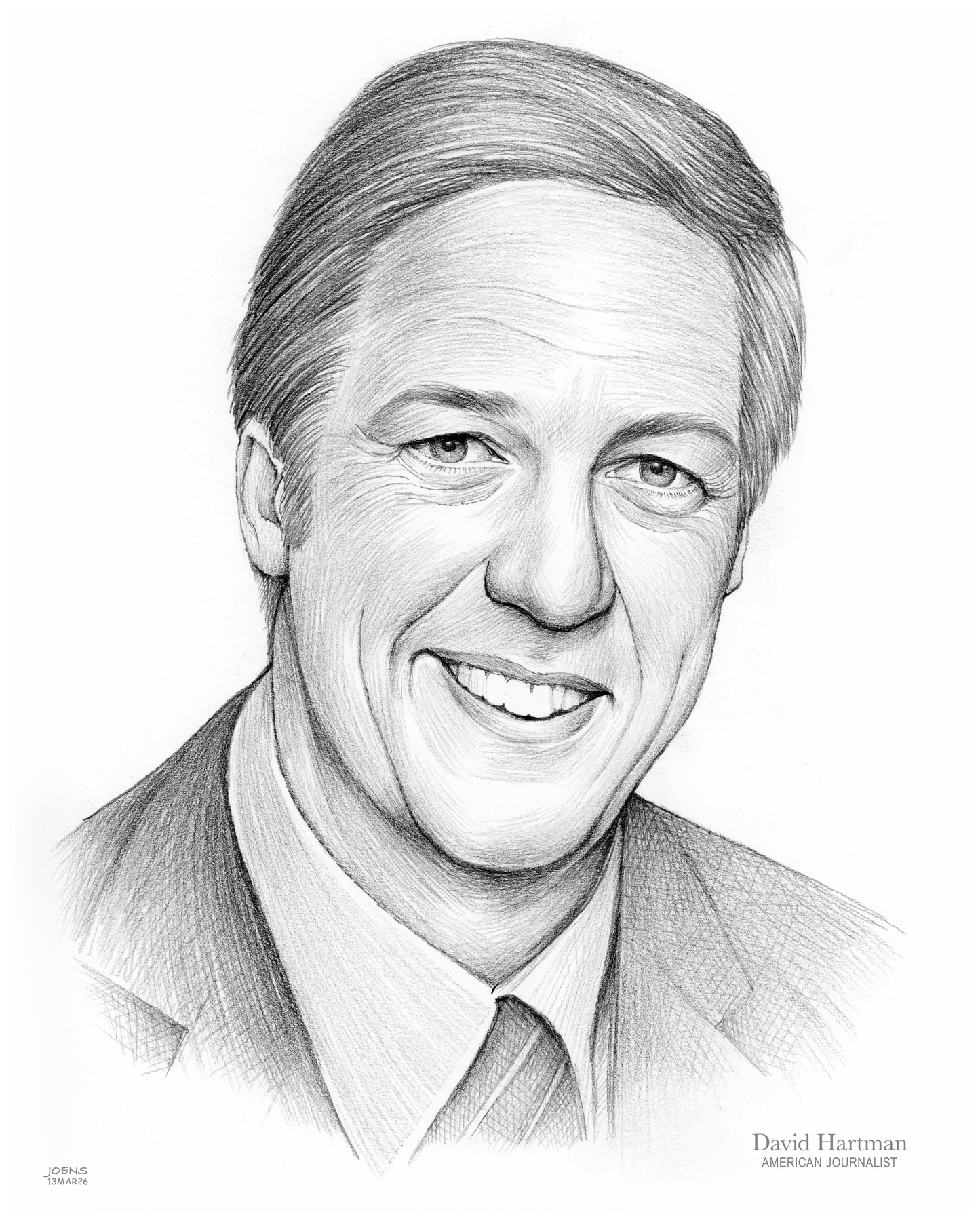David Hartman (born 1935) is a respected American journalist, actor, and television host best known as the original anchor of ABC’s Good Morning America. Beginning his career in acting, he appeared in films, on Broadway, and in television series such as The Bold Ones. In 1975, Hartman transitioned to journalism, bringing warmth, intelligence, and curiosity to morning news. His thoughtful interviews and calm presence set a new standard for broadcast journalism. Beyond television, he has narrated documentaries and specials. This tribute is accompanied by a portrait of David Hartman, skillfully rendered by pencil artist Greg Joens.