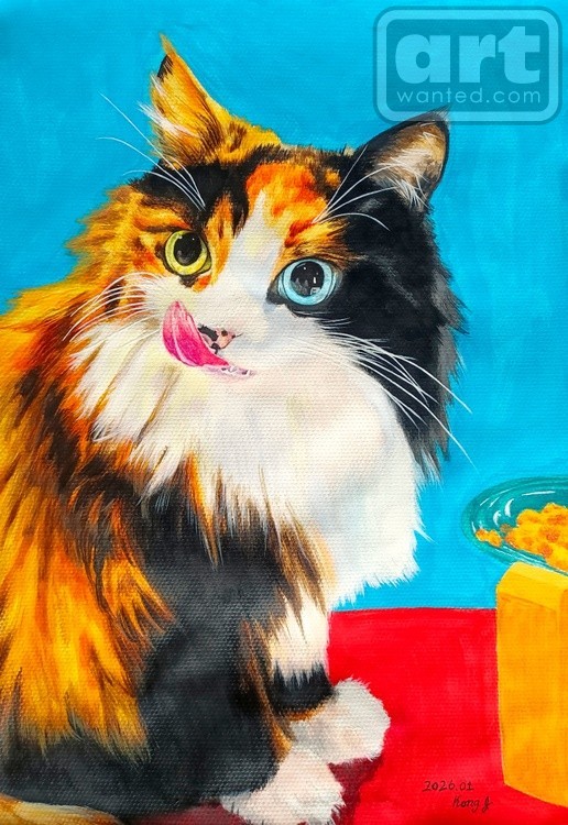Want more (26.5 x 38 cm, gouache on paper, 2026 finished) Cats are the most obedient when eating. Staring big eyed, still wanting more.
