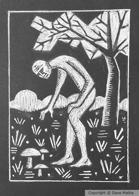 Another very woodcut-ish design, Dave. The mood is somber and the man is nude. Is the mushroom recreation or food? We'll let the viewer ponder that one, eh. Hope all is good. :)Joanie Holliday 9 hours ago