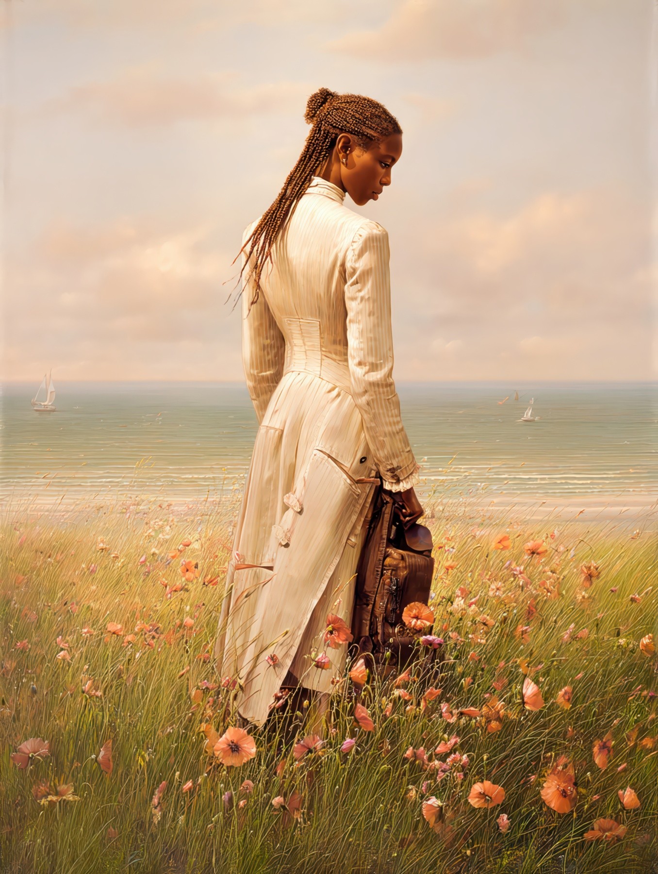 A serene and contemplative moment as a woman stands among wildflowers overlooking the sea, her posture filled with quiet grace. The muted tones of her flowing attire harmonize with the warm light of the coastal landscape, evoking themes of solitude, reflection, and timeless beauty