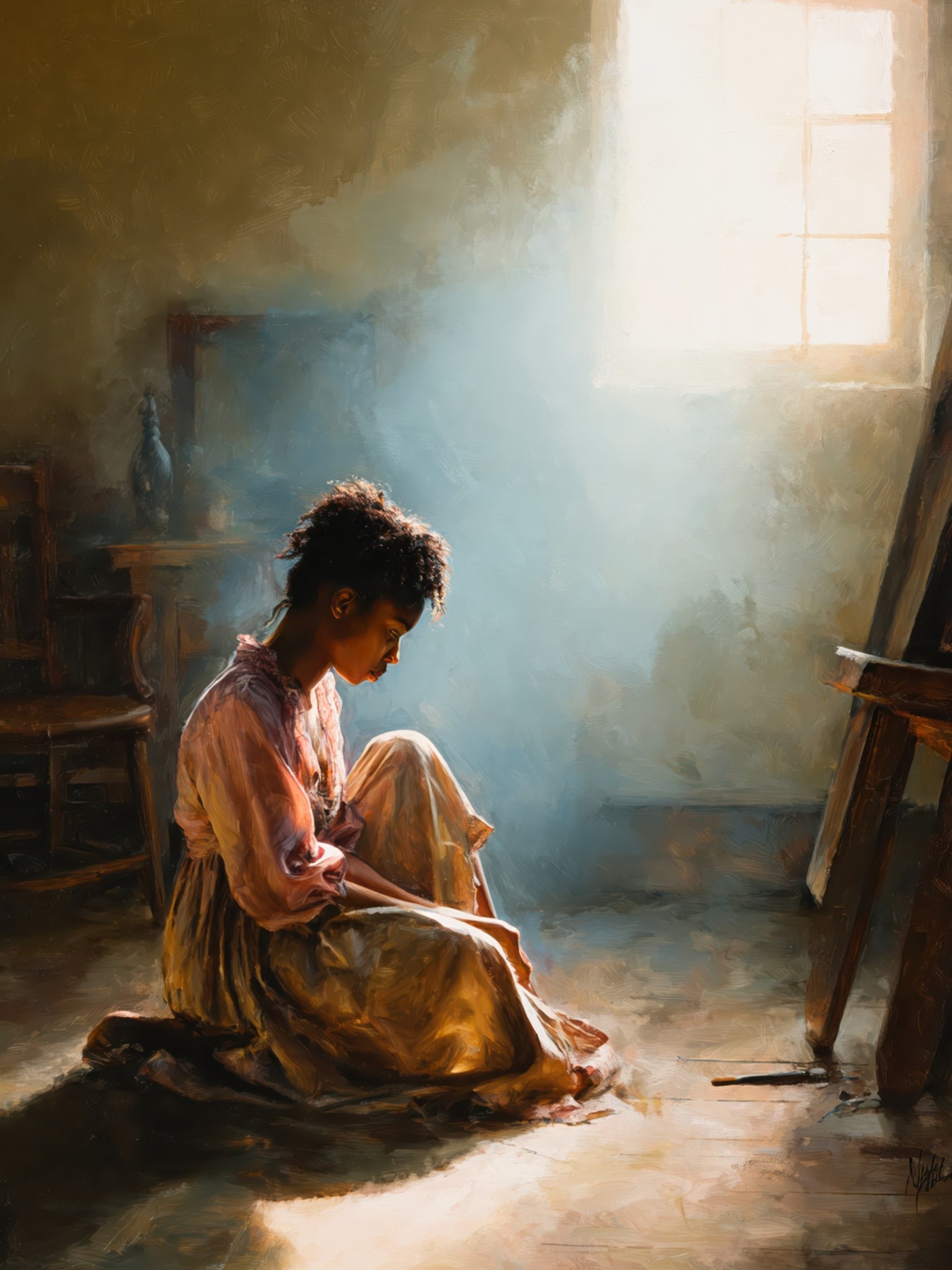 This piece explores the stillness before artistic creation—the sacred pause where the artist turns inward to confront both uncertainty and vision. Light becomes a silent collaborator, illuminating not the work itself, but the emotional terrain that precedes it. In this quiet solitude, the act of making art is revealed not as a performance, but as a deeply personal meditation—one where vulnerability, patience, and introspection shape what is yet to come.