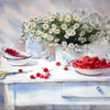 Beautiful partnering of daisies and cherries with the white table. Very lovely. - Laura |