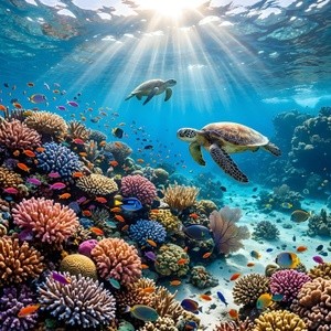 Two graceful sea turtles navigate a breathtaking vibrant coral reef underwater scene