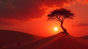 Dramatic red sunset bathes a solitary desert tree on a sweeping sand dune