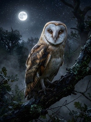 Captivating barn owl perched on a misty tree branch under a full moon.