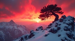 Solitary tree on a snow-covered ridge illuminated by a dramatic red sunset.
