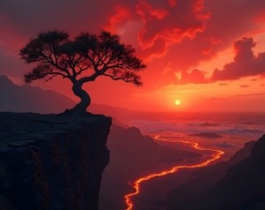 Twisted tree on a cliff edge under a fiery volcanic sunset