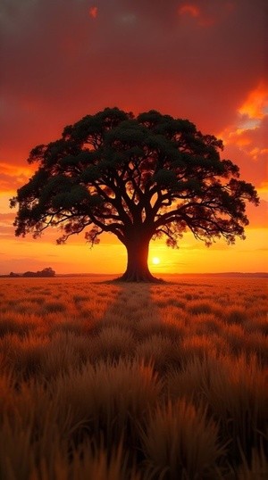 Solitary majestic oak tree standing tall amidst a vibrant golden sunset meadow