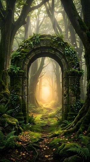 Ancient moss covered stone archway leads into mystic sunlit forest