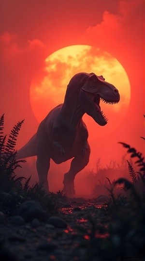 Mighty tyrannosaurus rex dinosaur roars under a glowing red prehistoric sunset.