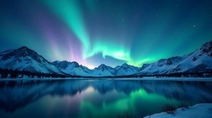 Stunning vibrant northern lights glowing brightly above snow covered mountain lake peaks