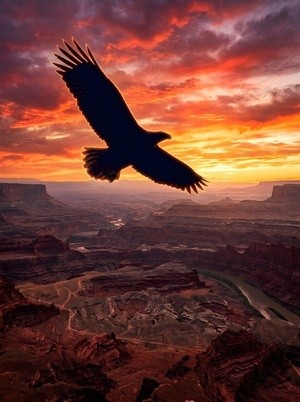 Powerful eagle silhouetted against a fiery canyon sunset sky