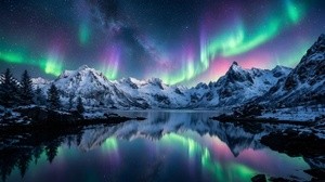 Vibrant aurora borealis lights illuminate snow capped mountains above a calm lake