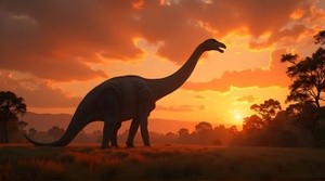 Giant prehistoric dinosaur silhouette standing against a vibrant sunset sky