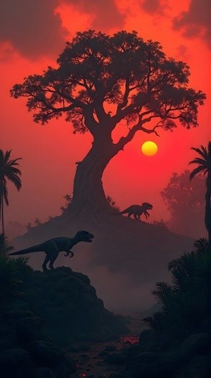 Two predatory dinosaurs hunting during a vibrant red prehistoric sunset landscape scene