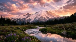 Beautiful snow-capped mountain with a winding river through a wildflower meadow at sunset