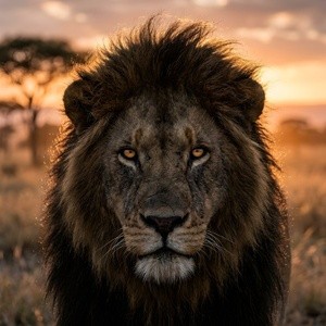 Powerful male lion with an intense stare illuminated by the golden sunset.