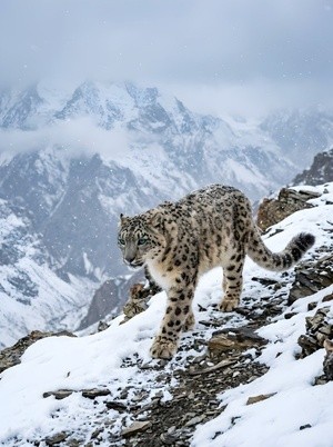Rare snow leopard with piercing eyes traversing a rugged snowy mountain slope.