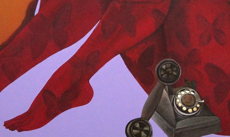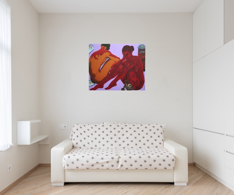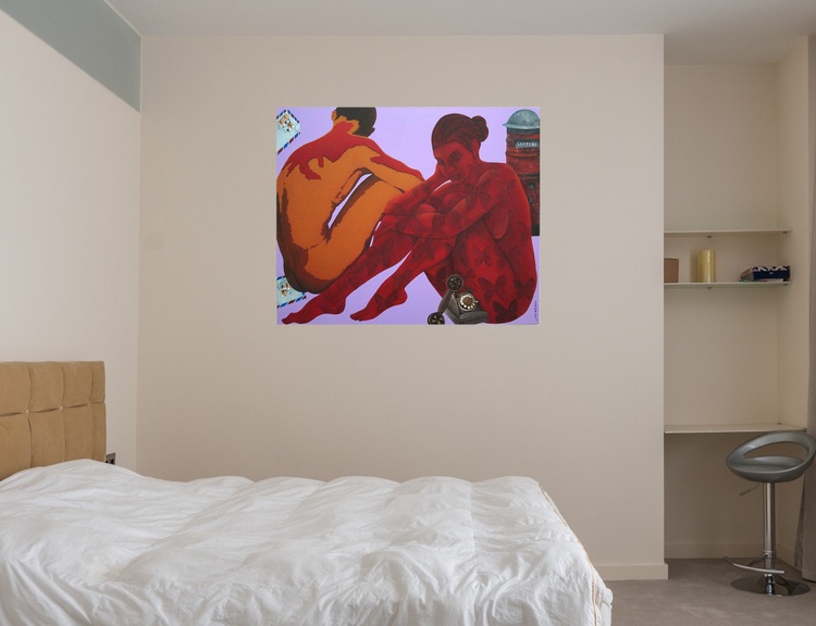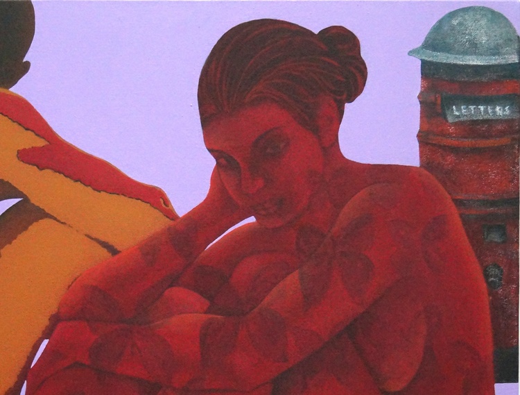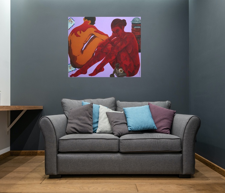 This is an original contemporary figurative painting of a rectangular shape. It is an acrylic on canvas artwork with a lavender background. At the right of the painting, we see a beautiful lady sitting gracefully in an artistic pose. Her lover is sitting on the left. The entire composition is in vibrant hues of red, brown, ochre, and more in a very balanced manner, making the painting very attractive. The female figure is covered in my signature style of symmetrical forms like butterflies. I have added elements like letters, letter box and telephone not only to add beauty to the composition but also as symbols of communication between a couple in love who are not together but are yearning to be in touch.