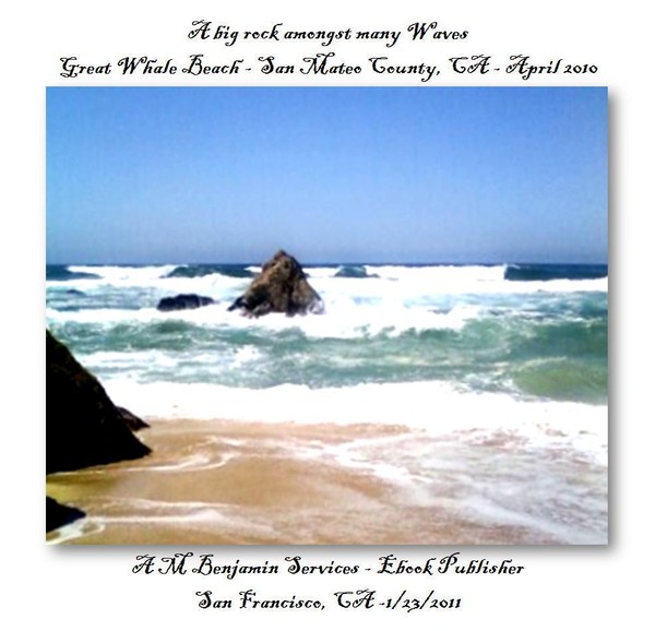 a picture of a triangular rock amongst many waves at Great Whale Beach in San Mateo County, California