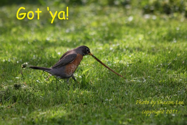 This robin has a nest next to my house and she is looking for her breakfast! And she got it! Photo by Sharon Lee, copyright 2011