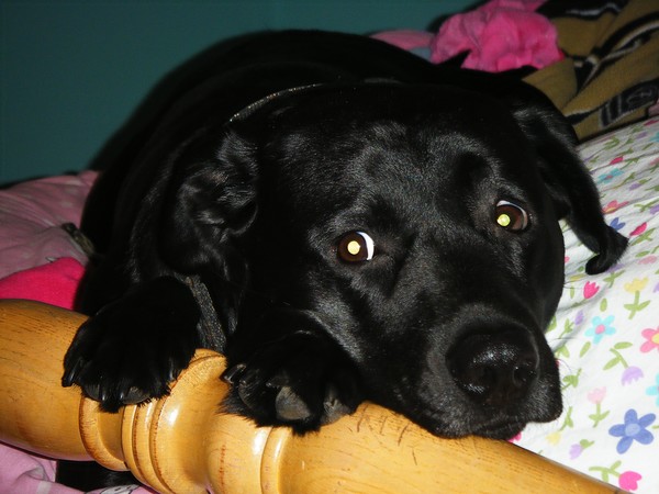 My 4 year old Black Labrador, Isabelle, waking up from a nap on my bed : )