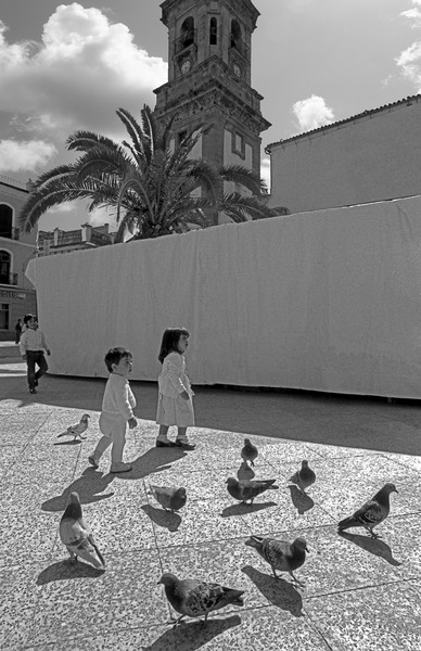 Toddlers and pidgeons in black and white in the Spanish town of La Linea de la Concepcion, Andalucia, Spain.