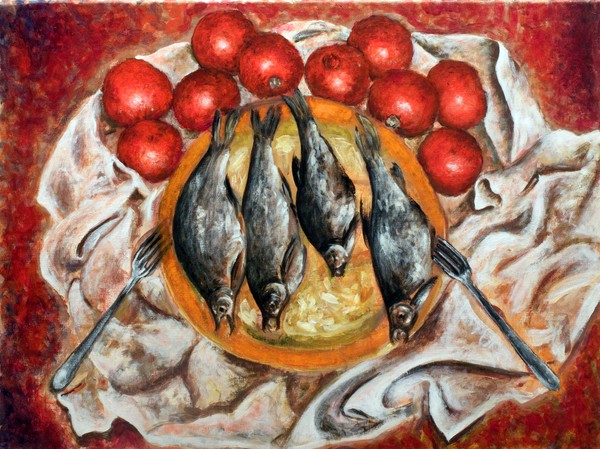 Dry fish have so natural shape and color that I fill the smell. Scarf is very interesting in this situation - it is remind me the fishnet. The fact that it is red, can tell to the viewer about fish blood and death.