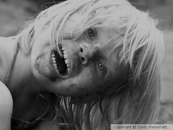 My crazy girl, covered in coal dirt, being a zombie.