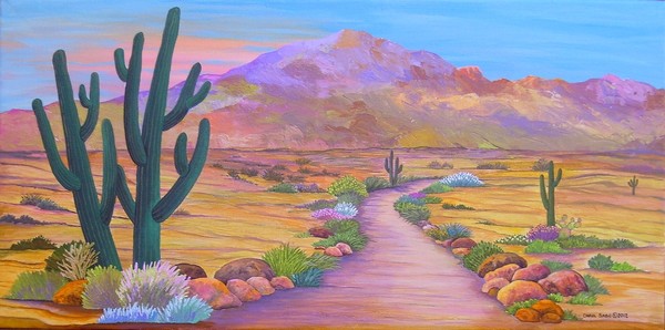 This is located in Phoenix Arizona. McDowell mountain in the background with a path the leads your eye back. The cactus to the left frames this all in. Acrylic on a gallery wrapped canvas, painted sides, wire on the back. Signed lower right and on the back. Created and Copyrighted in 2012. Comes with a Certificate of Authenticity & Artist Bio.